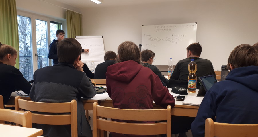 Am Samstag Vormittag durften die Schüler einem Vortrag von Maximilian Keßler über die Pellsche Gleichung, eine diophantische Gleichung 2. Ordnung, lauschen, während die Älteren einen Vortrag von Leon Hendrian über die Starrheit von Polyedern anhörten. Anschaulich heißte das, dass ein Polyeder noch verformbar ist, solange man nur die Kanten gegeben hat, wie z.B. in einem Magnetmodell, aber nicht mehr, sobald auch die Flächen gegeben sind. Anschließend referierte Nicholas Schwab, ebenfalls bei den Älteren, über den Hilbertschen Nullstellensatz. Mittags fuhren wir dann alle zum Christkindlmarkt in Nördlingen, der in einer halben Stunde leicht mit dem Zug erreichbar war. Dort verbrachten wir den Nachmittag, bis es abends wieder zurück nach Donauwörth ging. Wie am Vortag wurde nach dem Essen gespielt und es fand sogar ein spontaner Tanzabend statt.